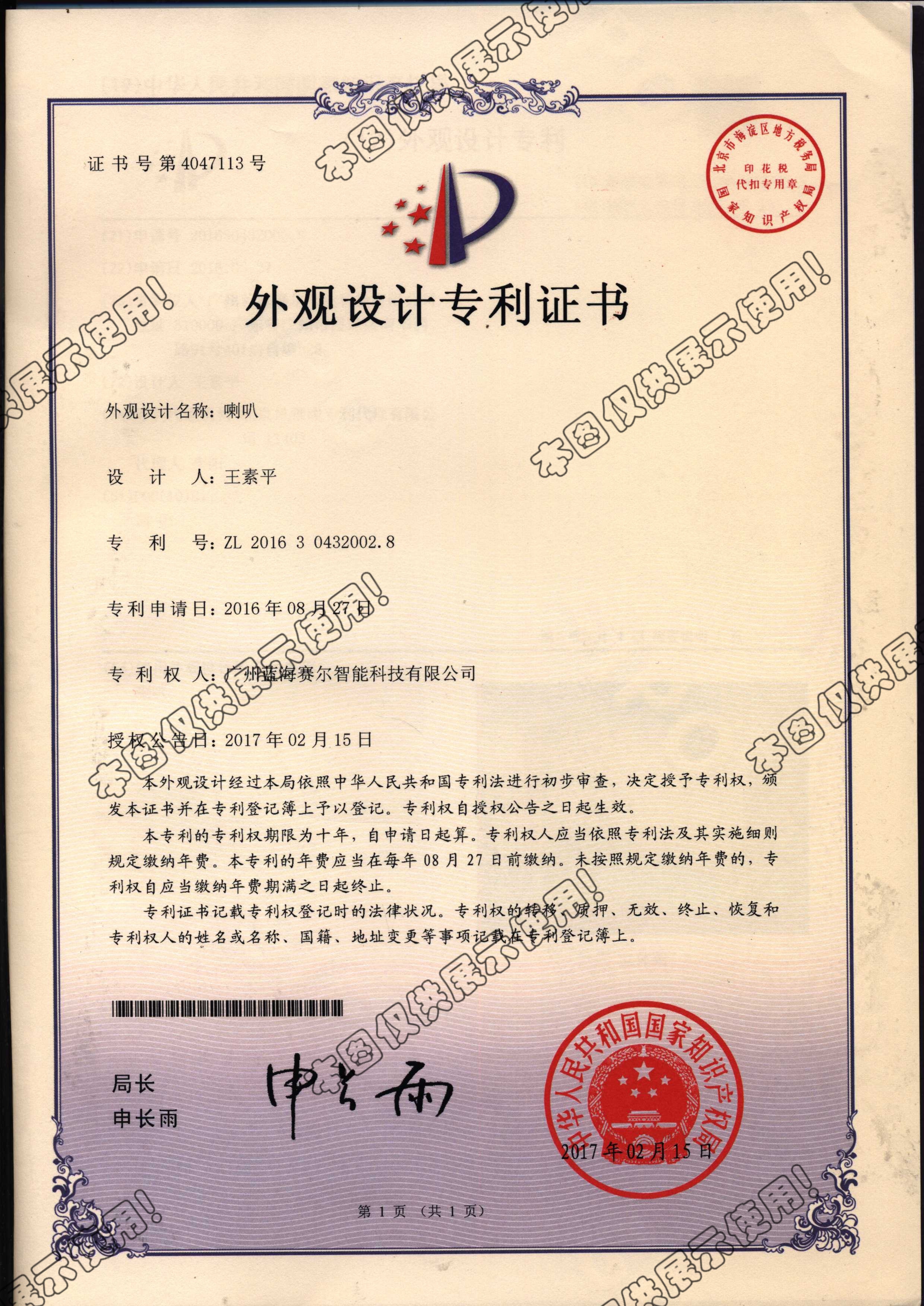 102喇叭外观设计证书