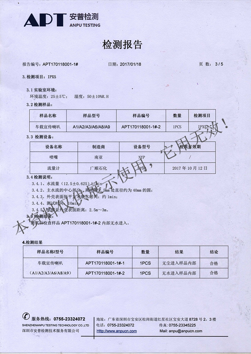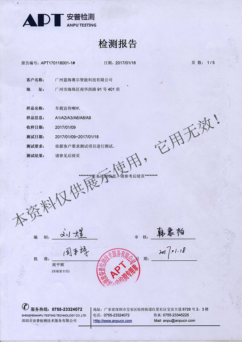 车载宣传喇叭A1、A2、A3、A6、A8、A9检测报告