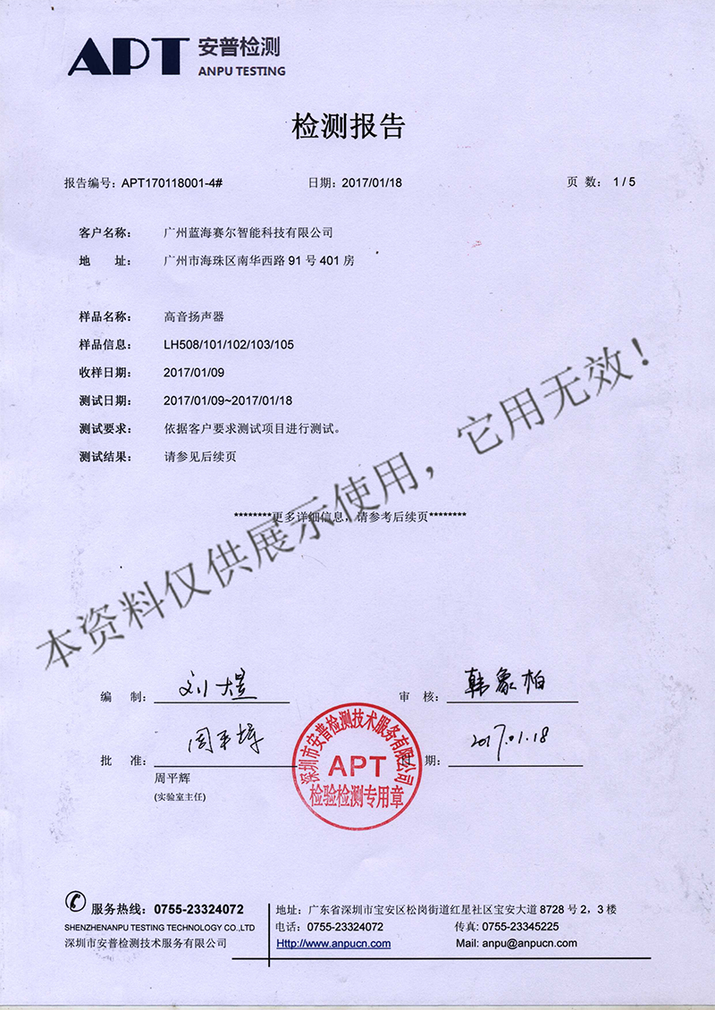 - 【上一篇】:高音扬声器LH300、301、302检测报告