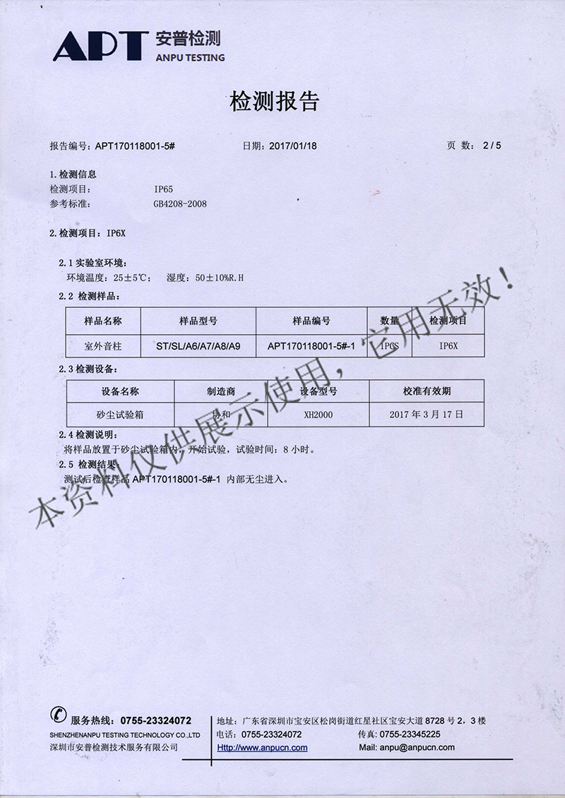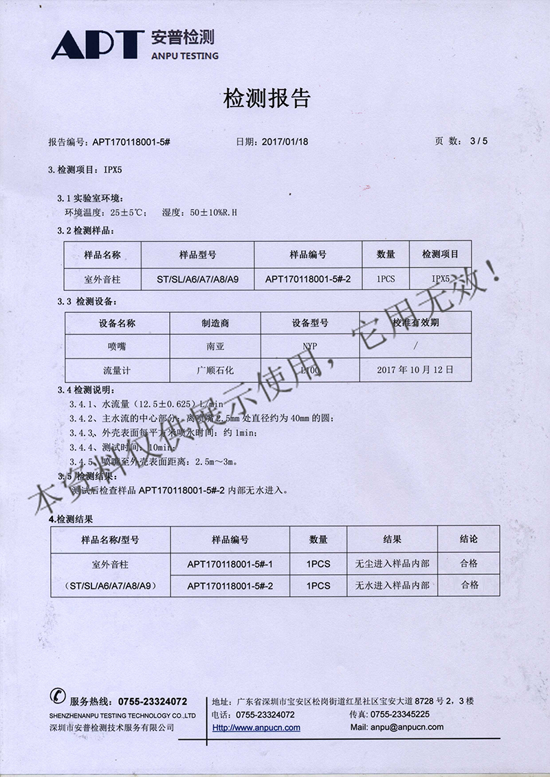 室外音柱ST、SL、A6、A7、A8、A9检测报告