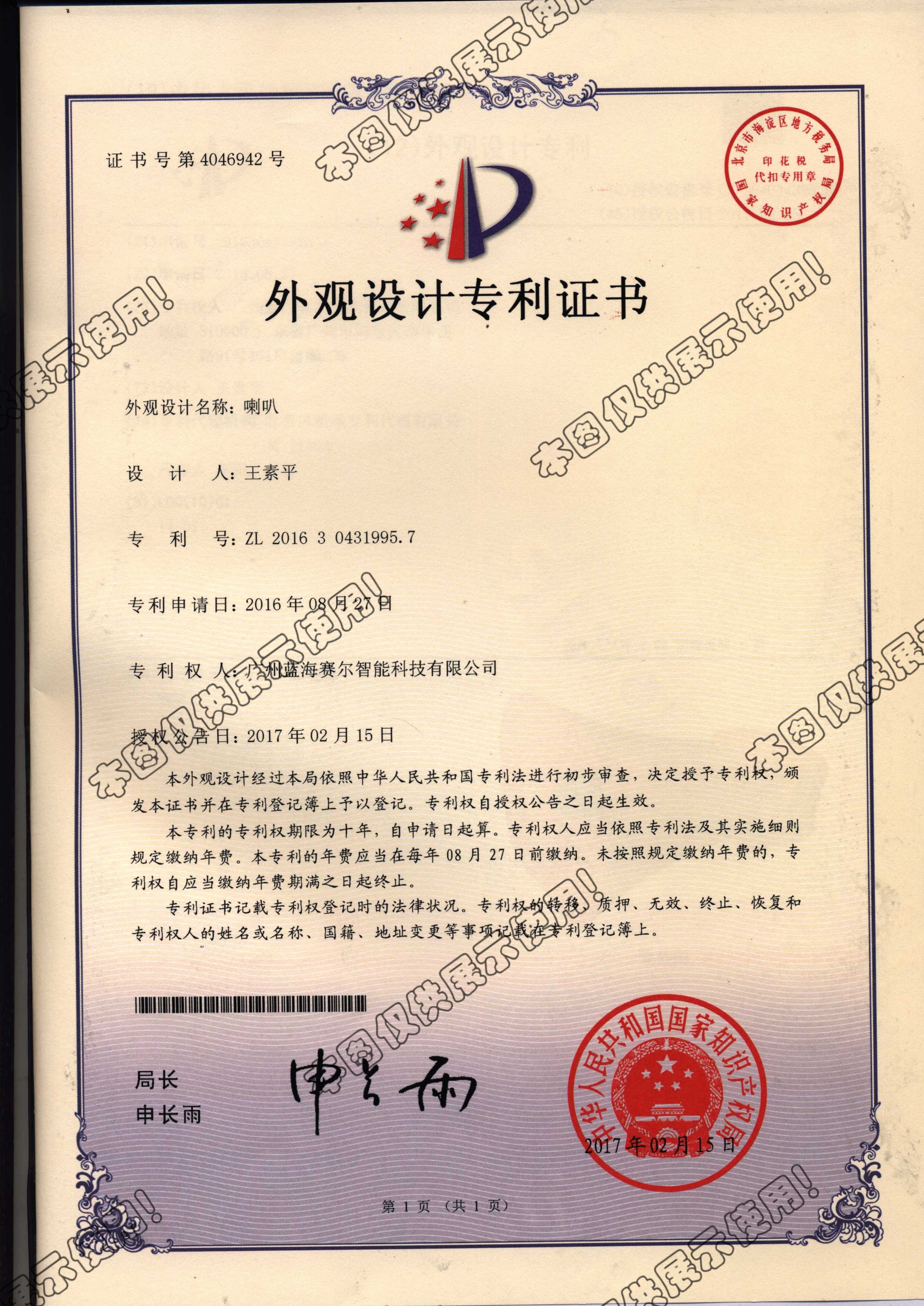 - 【下一篇】:203双口喇叭外观设计证书