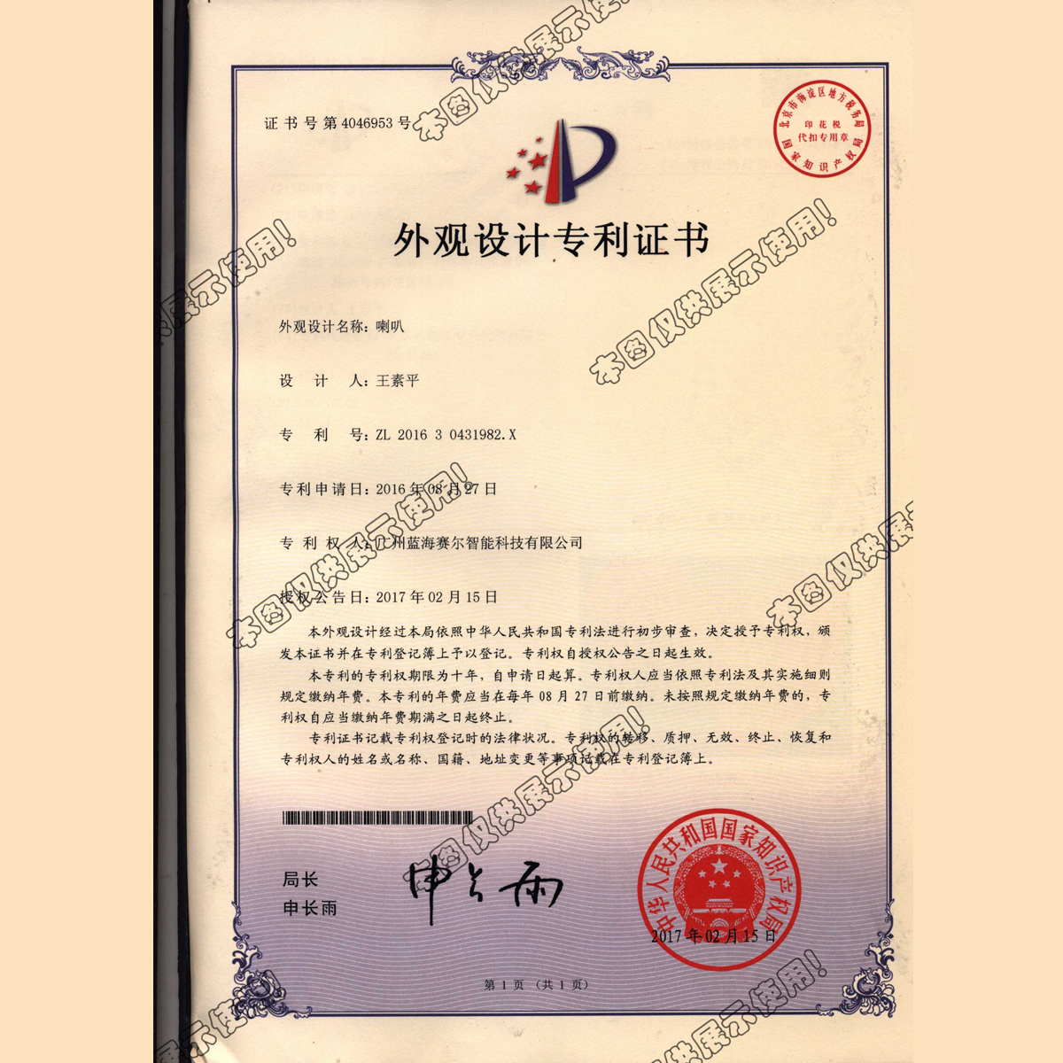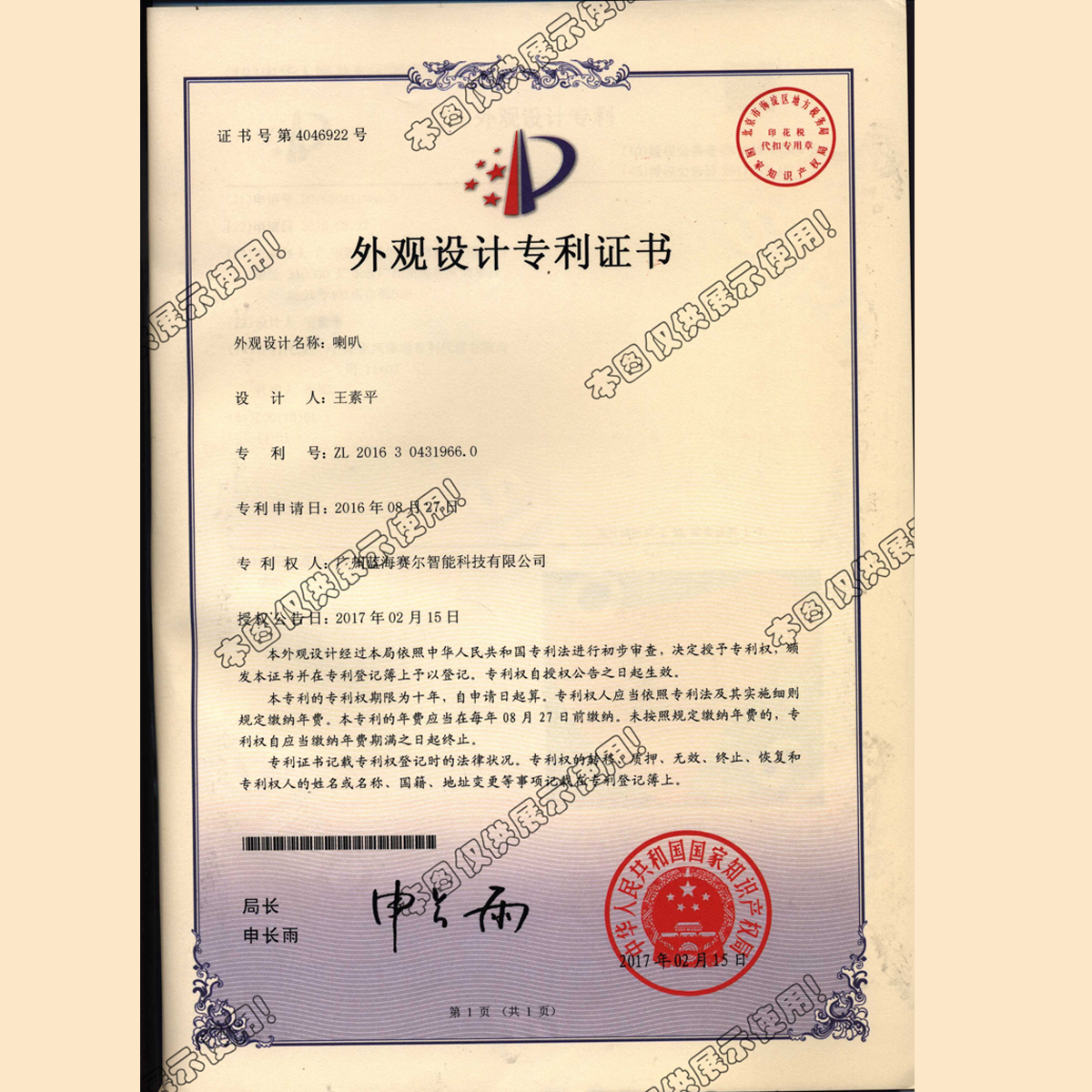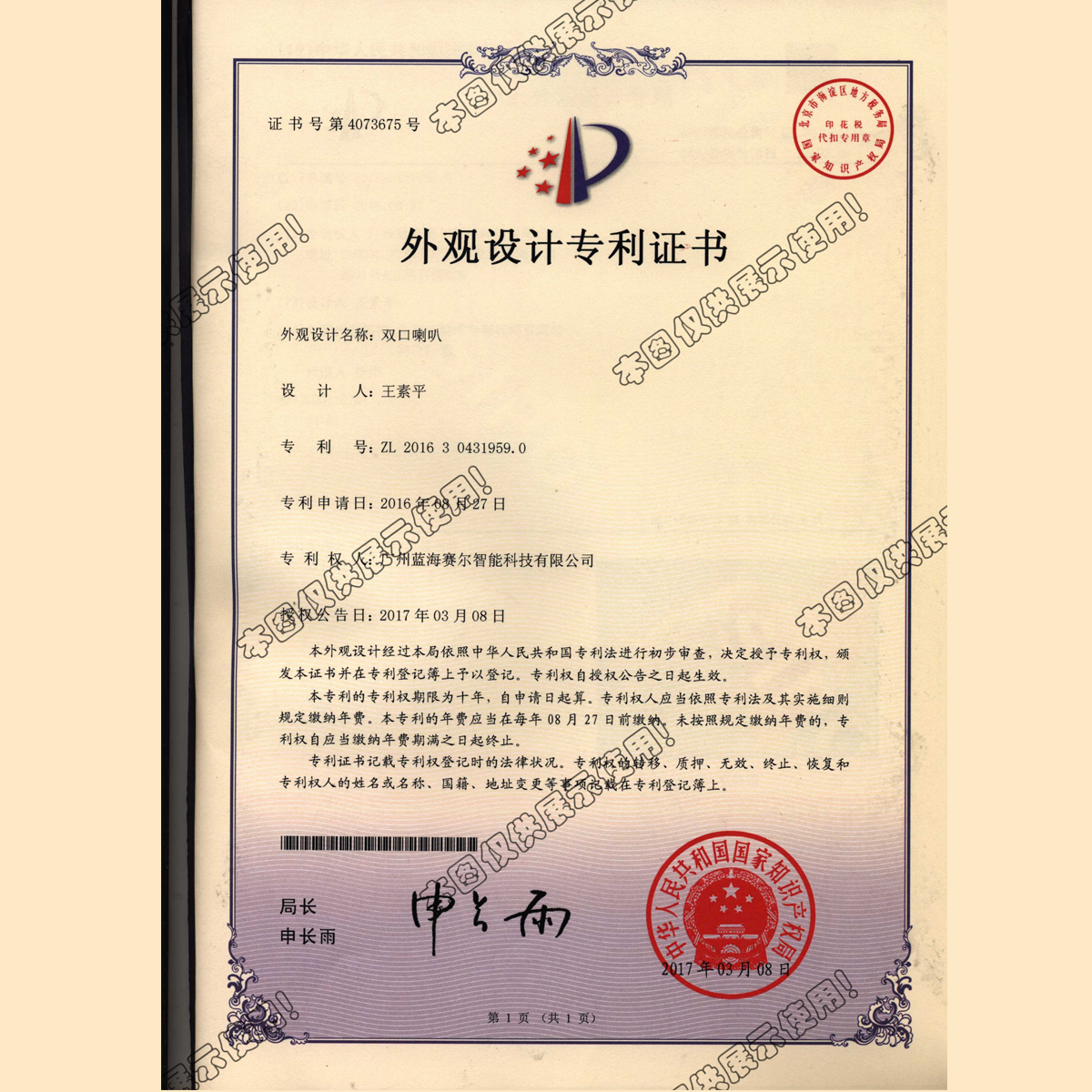300喇叭外观设计专利...